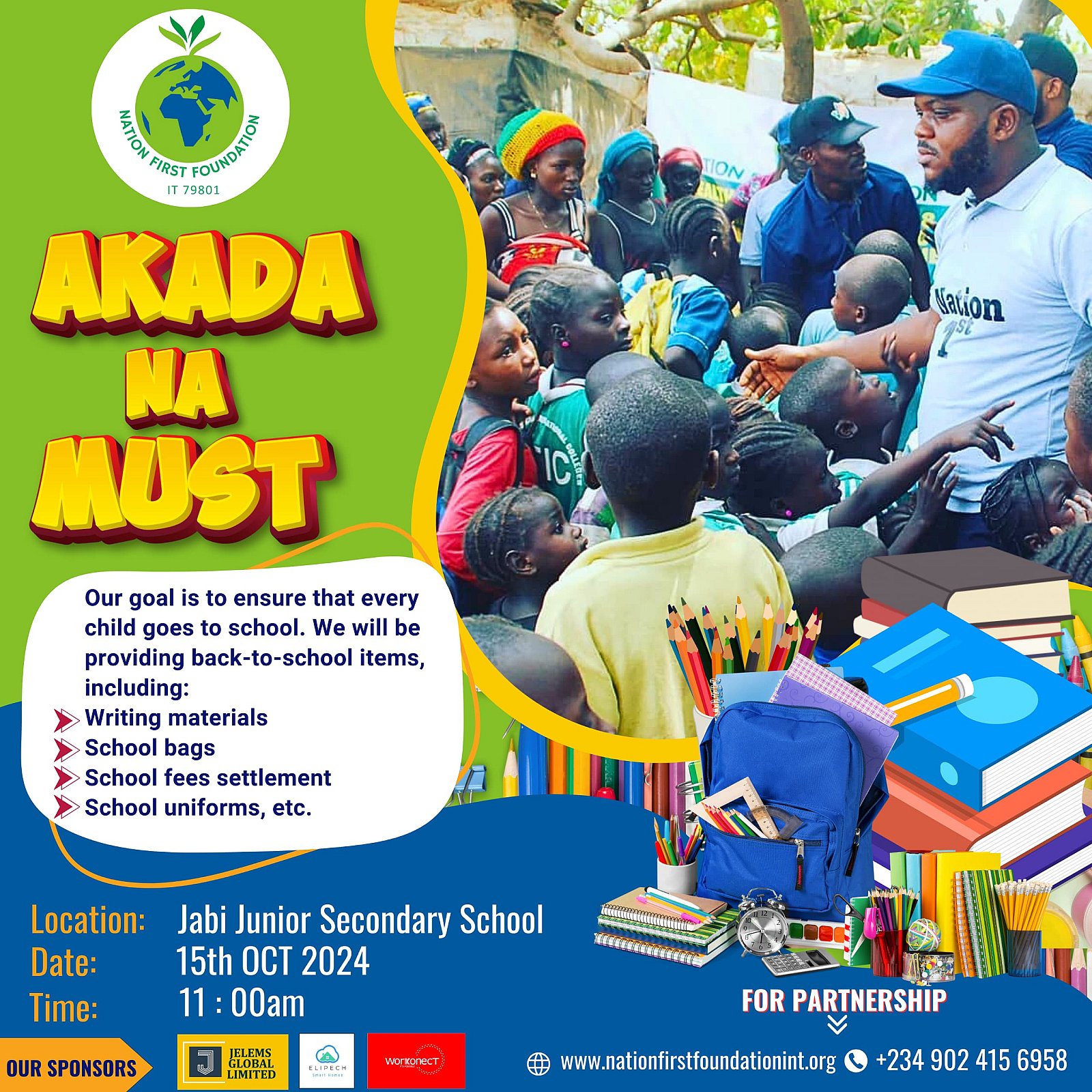 The 3rd edition of the Akada-na-Must/Back-to-School Outreach held on the 18th of October 2024, was focused on tackling the issue of out-of-school children in Nigeria, especially from disadvantaged backgrounds. This programme, organized annually by Nation First Foundation, continues to ensure that children who have dropped out of school are provided with the necessary resources and opportunities to return to education.